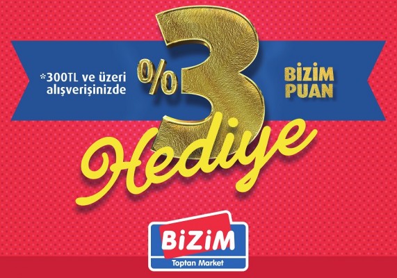 Bizim Toptan, 300 TL ile 5000 TL arasında alışveriş yapan müşterilerine yüzde 3 Bizim Puan hediye ediyor. Kampanya, Eylül sonuna kadar sürecek. Hediye puanlar, müşterilerin Bizim Kart’larına yüklenecek ve 8-31 Ekim tarihleri arasında yapılacak alışverişlerde kullanılabilecek.