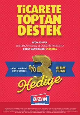 Türkiye organize toptan ticaret sektörünün, 69 ildeki 175 mağazasıyla en büyük ve yaygın markası Bizim Toptan, 300 TL ve 5000 TL arasında alışveriş yapan müşterilerine Bizim Puan hediye ediyor. Şirketin yeni kampanyası 30 Eylül’e kadar sürecek.