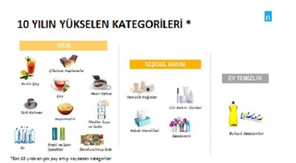 10 yıl önceye nazaran içecek kategorilerinin ağırlıklarını artırdıklarının gözlendiğini vurgulayan Nielsen Müşteri Hizmetleri Direktörü Yankı Yalçın ise “Sağlıklı yaşam trendiyle birlikte maden suyu ve soda, kahve zincirlerinin yarattığı kahve akımının etkisiyle kahve ve sektöre yönelik yeni yatırımların sonucu olarak da buzlu çay ve enerji içecekleri kategorileri özellikle öne çıkıyor. Bunun yanı sıra tüketicinin hızlı ve pratik çözüm ihtiyacına yanıt veren dondurulmuş gıda ve atıştırmalık kategorileri de büyümeleri ile dikkat çekiyor. Kişisel bakım ve ev temizliğinde ise daha çok kategori penetrasyon artışlarının etkisi göze çarpıyor. Deodorant, cilt bakım ürünleri ve bulaşık deterjanları buna verilecek örnekler arasında yer alıyor.” açıklamasını yaptı.